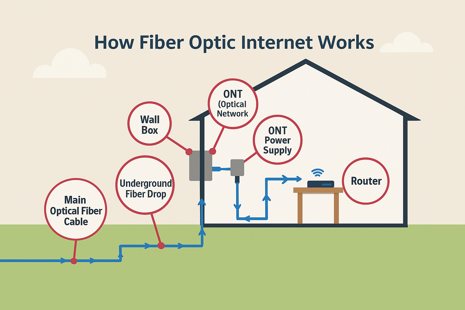 Instead of using radio waves (like wireless broadband) or copper lines (like DSL), fiber transmits data using pulses of light that travel through thin strands of glass. These fibers are as thin as a human hair but can carry massive amounts of data over long distances with minimal loss.