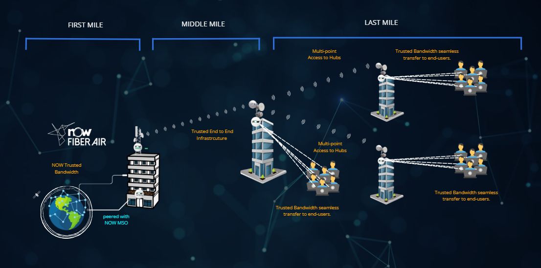NOW Fiber Air operates on a multi-layered network model, divided into distinct segments: First Mile, Middle Mile, and Last Mile. Each segment plays a crucial role in delivering secure, end-to-end trusted bandwidth.